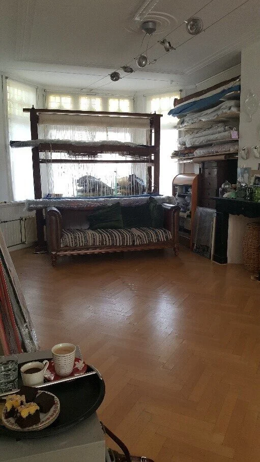 We gaan mét de koffie naar de eerste verdieping waar Marianne over de volle diepte van het huis - twee kamers en suite - haar atelier heeft. Aan de ene kant staan de schilderspullen aan de andere kant staat een enorm weefgetouw. “ Mijn beide ouders waren kunstenaar en ontmoetten elkaar op een symposium over kunst in Boedapest. Mijn vader ontwikkelde zich na de Kunstacademie - tot mode- en schoenontwerper. Hij ontwierp voor de schoenfabriek in mijn geboortestad waar hij werkte een comfortabele, kleurrijke kinderschoen van zacht leer met een speciale zool. Met dat ontwerp werd de fabriek een tijd lang de beste van Midden-Europa. Hij kreeg de ruimte om regelmatig op reis te gaan naar het Westen, bijvoorbeeld naar Italië, het land van het meest spannende design, en kwam dan met speciale materialen terug.”
