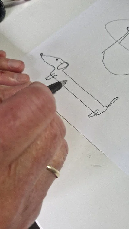 “Toen ik klaar was met school ging ik eerst werken bij een glasinstrumenten-makerij. Daarna ging ik als zzp-er verder en werkte voor bedrijven als TNO en de Technische Universiteit (TU) in Delft. Ik huurde in 1974 een pandje in de Weimarstraat in Den Haag met aan de voorkant een winkeltje en achterin een werkplaats. Daar begon ik naast mijn opdrachten ook kunstwerken van glas te maken, lekker spelen met glas. Ik ontwierp bijvoorbeeld kleine dieren van glas, zoals een teckel en varkentjes en maakte er ook nog kindertjes in de buik bij. Dat was helemaal nieuw, mensen gingen dat verzamelen. Ik heb er duizenden gemaakt.” Ming tekent ter plekke het ontwerp voor de teckel. “Ik kreeg ook veel opdrachten voor glaswerk waarop gegraveerd moest worden. Van alles, waaronder familiewapens en stadswapens of het wapen van een waterschap. Dat heb ik veel gedaan.” Er komt een boek tevoorschijn met werktekeningen en ontwerpen voor gravures op glas.