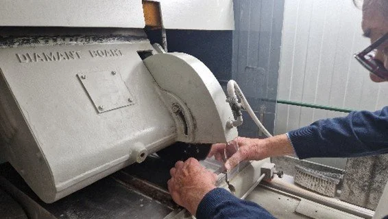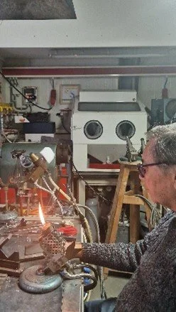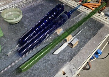 Ming’s glasatelier is eigenlijk vrij eenvoudig: een gasbrander vastgeklemd aan een tafel waaraan hij zijn creaties maakt. Het materiaal - glazen buizen, gekleurd en transparant - bestelt hij bij een fabriek. Voor zijn grote glasobjecten maakt hij gebruikt van optisch glas, dan zijn glasbroden die hij kan zagen, slijpen en polijsten. Er staat ook een snijmachine met een diamanten slijptol en een machine om te polijsten en Ming laat het me allemaal aan het werk zien.