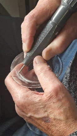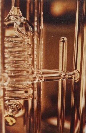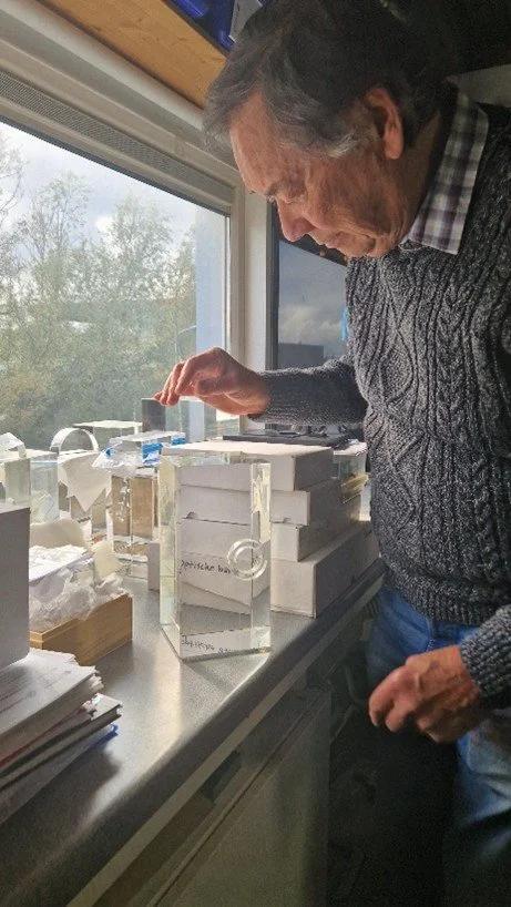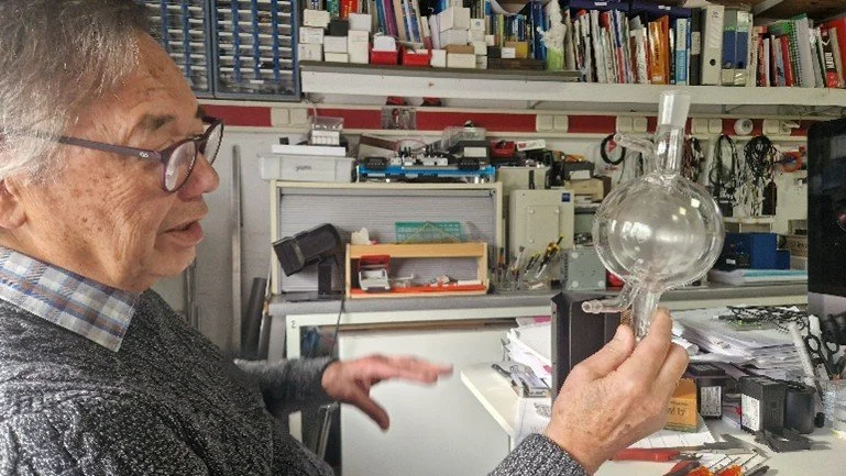 “Ik wilde altijd al iets met mijn handen maken. Thuis speelde ik met elektronica en bouwde ik radio’s. Ik zag mijn vader thuis ook kalligraferen - chinees schilderen - en ging ook tekenen en schilderen. Na de lagere school ging ik eerst naar de LTS-elektrotechniek waar ik instrumenten leerde maken. De leraar daar raadde mij aan om vervolgens naar de Instrumentmakers-school in Leiden te gaan, richting ‘glas’. Dat was in de jaren zestig en is een goede keuze geweest. We leerden laboratoriuminstrumenten van glas maken en fijnmechanica. Kijk, dit werkstukje maakte ik in het eerste jaar: een bolkoeler. Hier liep ik mee vooruit, ik maakte al meesterwerkstukjes - zo heet dat nog steeds in ambachtsjargon - in het eerste en tweede jaar. Ik kreeg ook het vak ‘ontwerp en design van laboratoriuminstrumenten’ en dat vond ik heel leuk. Ik heb nog steeds een aantal laboratoria als klant en maak alles zelf, ook de metalen behuizing. Kijk, dit is een onderdeel dat ik helemaal gemaakt heb. Daar zit saffier-glas in.” Ik zie prachtig handwerk!