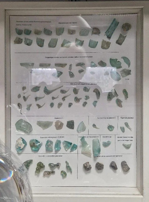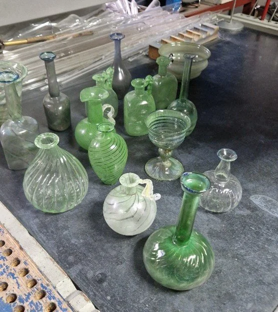 Ming illustreert zijn onderzoekende geest en zijn gevoel voor experiment met nog een bijzonder verhaal. “Wij gingen vroeger met de kinderen vaak op vakantie naar Cyprus. De kinderen vonden daar op enig moment glasscherven. Ik zocht mee en vond stukjes gebroken glas, aftik-scherven en complete fragmenten van glas die met een pincet waren weggetrokken. Je kon de pincetknepen nog zien zitten. Wat bleek? We hadden een Romeins glaswerkplaats gevonden van honderd jaar na Christus, toen konden de Romeinen het al. Ik nam contact op met het museum in Limasol op Cyprus. De conservatrice daar kende de plek wel maar had geen materiaal gevonden. Het glaswerk dat ik had gevonden, waaronder mooie flesjes, moest ik afstaan. Wel nam ik veel scherven mee die ik hier omsmolt en waarvan ik flesjes en kommetjes heb geblazen met de techniek die de Romeinen toepasten. Dat Romeins glas blaast heel lekker. Ik maakte fantasiereplica’s en maakte ook de omgeslagen rand in het ontwerp van de Romeinen.”