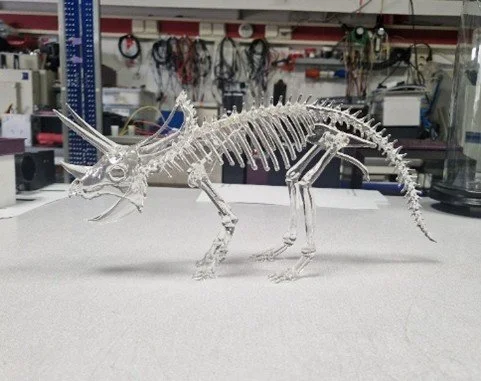 Ik maakte ook geleedpotige dieren zoals kreeften en dinosaurussen. Zoals een Triceratops waarvoor ik eerst een schets maak en daarna een werktekening. De schedel blaas ik op en de hoorns smelt ik op de neus. De botten van de voor- en achterpoten lijken op menselijke botten vanwege de scharnieren. Die maak ik apart en smelt ze later vast aan de romp. En dan de ribben: alles is van glas, soms apart gemaakt en dan aan elkaar gesmolten. En de onderkaak kan bewegen.” Ming laat het me zien. “Ik ben gewoon lekker bezig - met de dino alles bij elkaar zo’n twee dagen - en als het nodig is, verander ik het. Het moet anatomisch wel kloppen.”