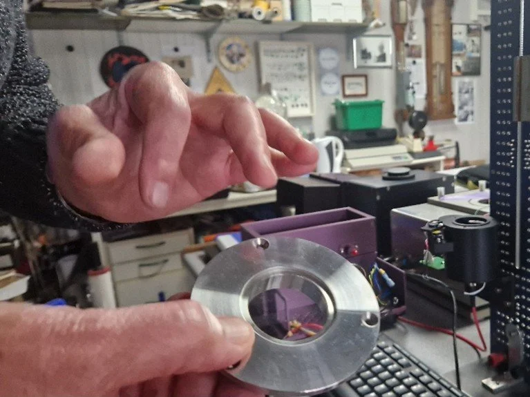 Onderdeel voor een laboratorium-instrument met saffier-glas. Ook de behuizing maakt Ming zelf