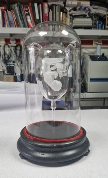 “Ik was in mijn jonge jaren gefascineerd door de complexiteit van de instrumenten die ik maakte. Dat wilde ik in glas ook doen. En zo kwam ik uit bij het menselijk lichaam als inspiratiebron. Hoe complex zijn niet de organen: zo’n hart met al die vaten en kleppen. Ik maakte verschillende foetussen in glas, onder een antieke stolp. Die stolp neemt een vriend voor me mee die dol is op Franse brocantes. Voor een farmaceut maakte ik longen, voor cardiologen een hart van glas en voor een hersenchirurg hersenen met de hypofyse en allerlei details. Ik maakte ze allemaal in serie en geen enkel exemplaar was of is hetzelfde.