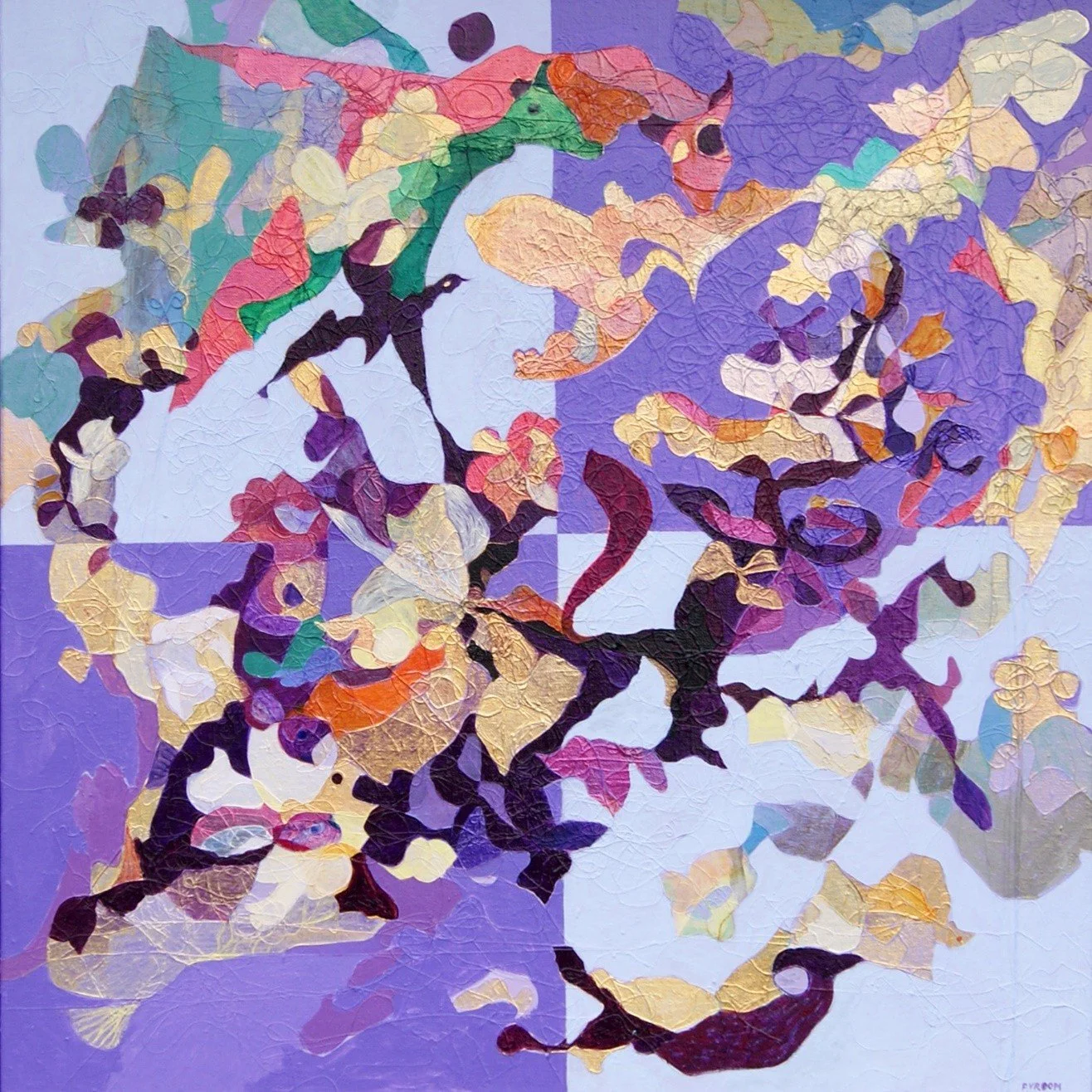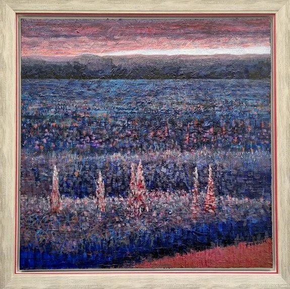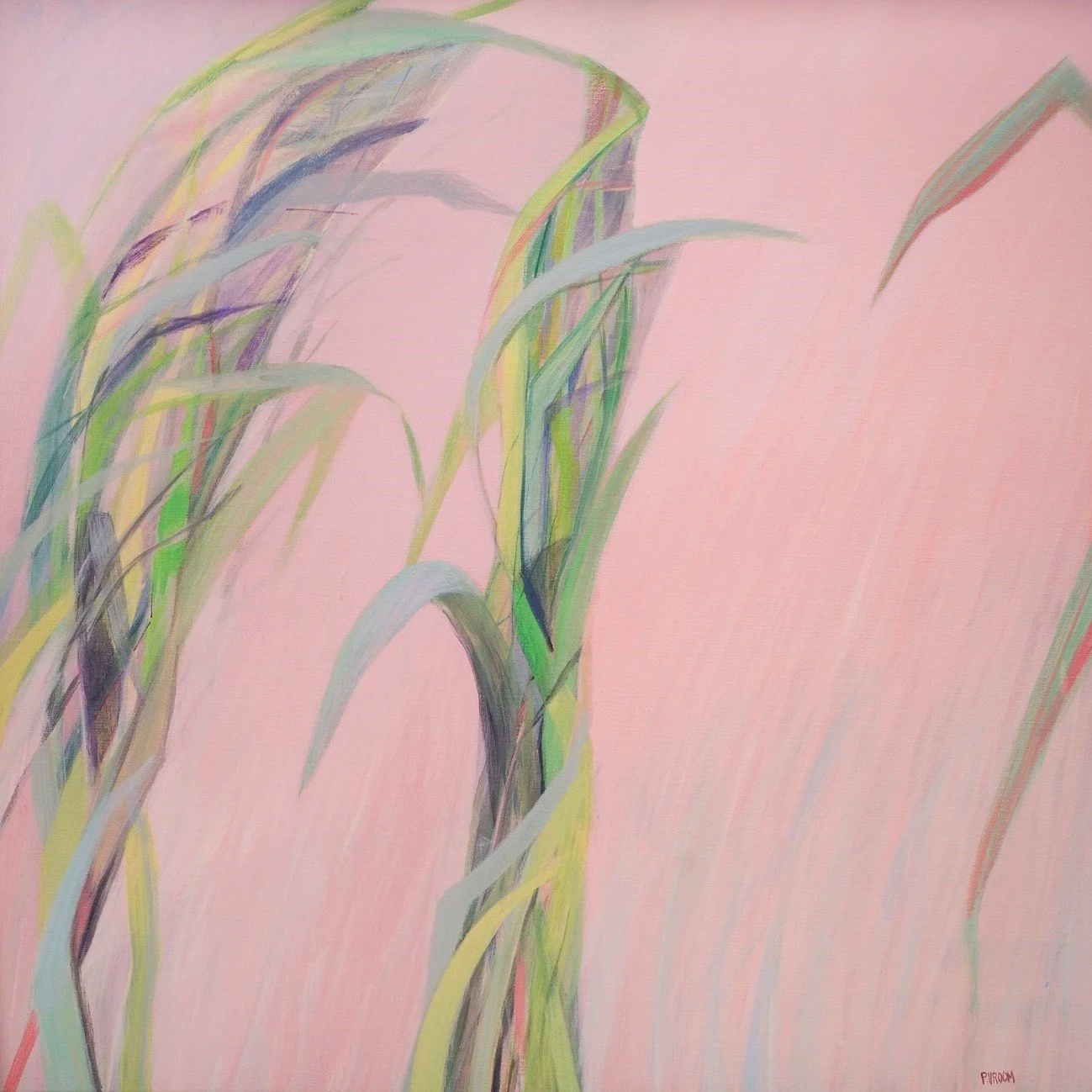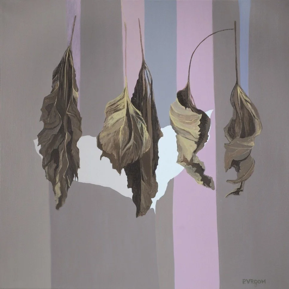 Avondlicht, 2025, acryl op linnen, 80 x 80 cm. Werk op de aloude manier om diepte te suggereren door op de voorgrond grotere vormen - hier de pluimen - te schilderen (foto Pauline Vroom)