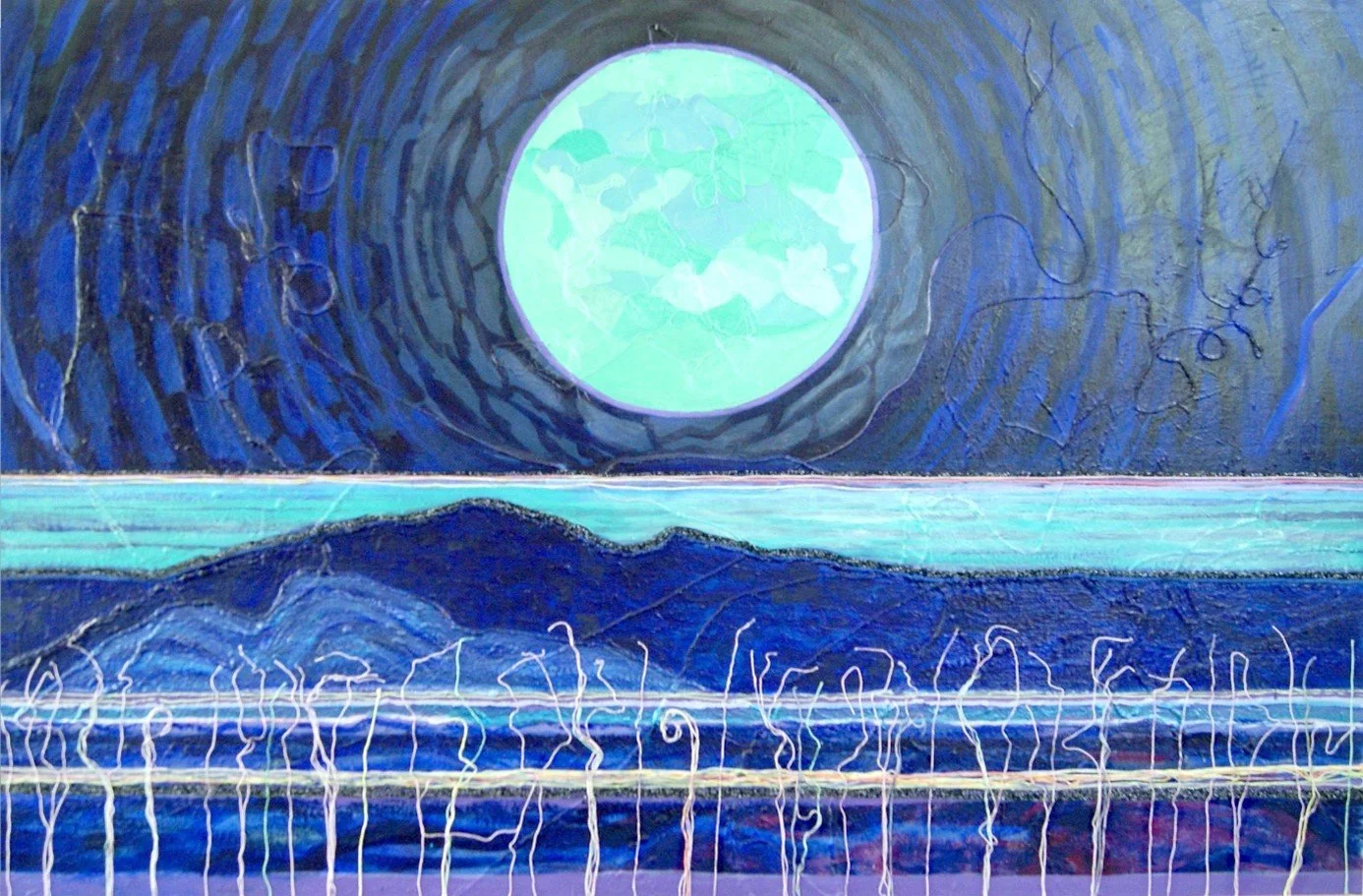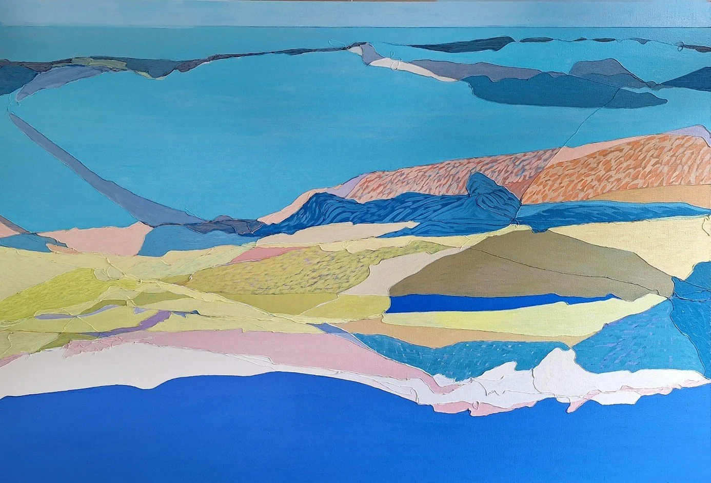 Zeelandschap, 2022/23, acryl en draad op linnen, 180x120 cm. Je kunt ver weg kijken in het werk van Pauline, het wordt bijna abstract (foto Pauline Vroom)