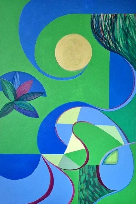 Ode aan de leraar, 2020, acryl en draad op linnen, 180 x 120 cm. ‘Plat’ werk met vormen uit de natuur. Met dit werk heeft Pauline in Rhenen een prijs gewonnen (foto Pauline Vroom)
