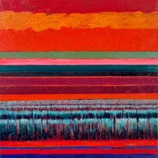 Rood landschap, 2018, acryl op linnen 80 x 80 cm. Diepte gesuggereerd met kleurstroken van verf (foto Pauline Vroom)
