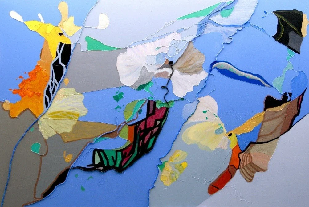Het werk van Pauline is heel gevarieerd en toch zitten er een paar constanten in. Ze schildert in acryl en werkt ook in gemengde technieken. “In mijn werk zitten een aantal sporen: van diepte naar juist plat, van fantasievorm naar geabstraheerde vormen vanuit de natuur en werken waarin ik beide probeer te combineren. Ik wil bijvoorbeeld diepte en ruimte creëren maar niet op de geijkte manier door iets groots op de voorgrond te zetten. Ik knok alles op het doek uit, werk als ik bezig ben puur vanuit mijn herinnering, knoop allerlei beelden aan elkaar en zoek en verander net zolang tot ik tevreden ben. Ik gebruik verschillende materialen. Zo heb ik werken gemaakt met stroken gescheurd papier van verschillende tinten. Dat geeft iets speels en - verrassend - ik kan er ook diepte mee creëren. De laatste jaren werk ik veel met draad. Wat ik daar zo aardig aan vind, is dat ik het draad wel op een bepaalde manier op het doek kan draperen maar dan moet het vastgelijmd worden en dan verandert de vorm weer. Het onvoorspelbare ervan spreekt me aan.”