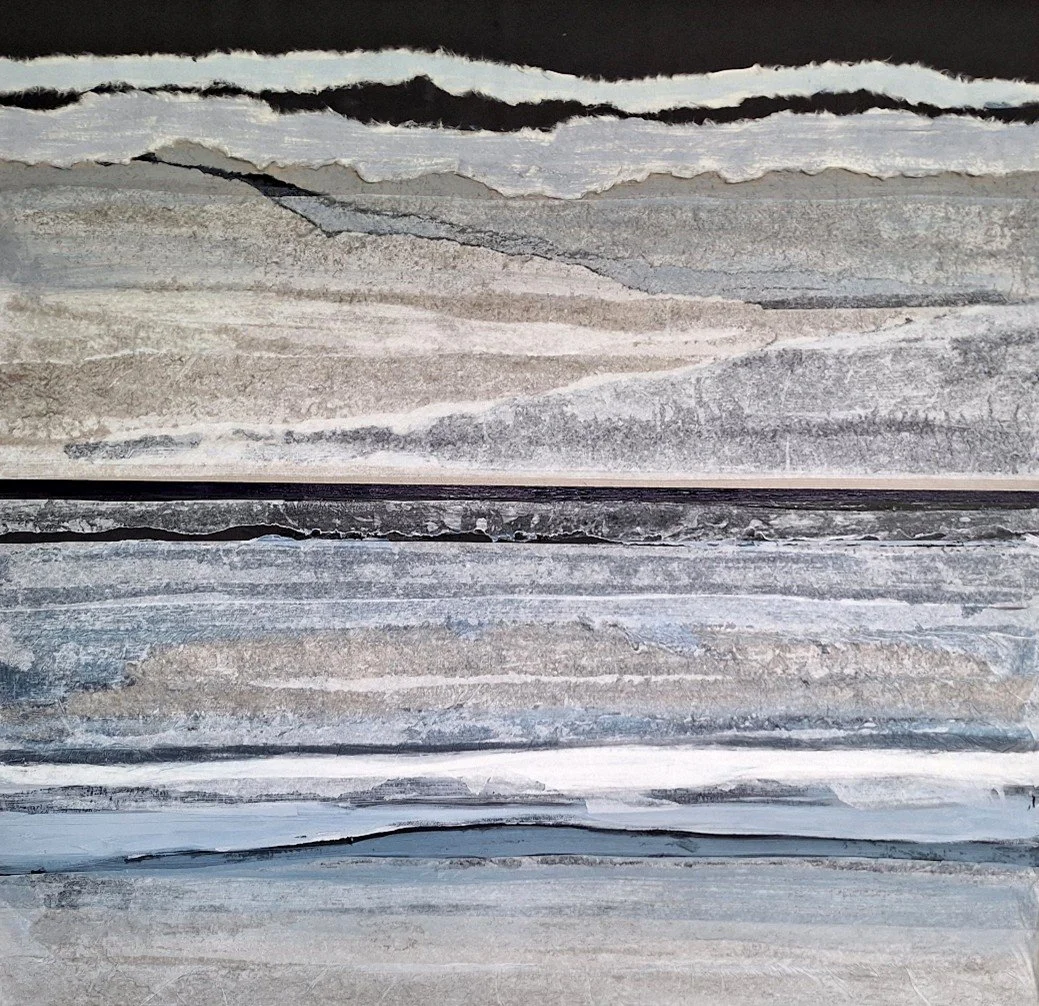 Landschap, 2018, papier op karton, 70 x 70 cm. Diepte gesuggereerd met stroken papier (foto Pauline Vroom)