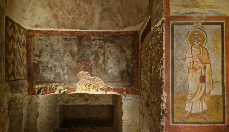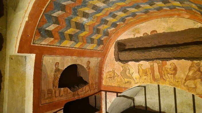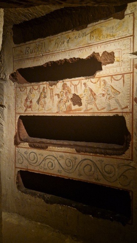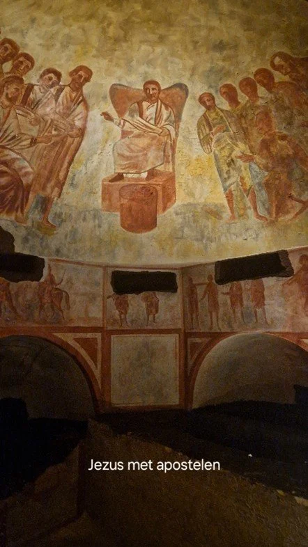 Replica van de fresco’s in een grafkamer van de Commodilla-catacombe (6de eeuw) in het Museum Romeinse Katakomben in Valkenburg. De grafkamer in Rome is pas in 2025 toegankelijk geworden voor bezoekers!