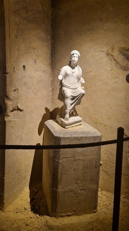 Replica in marmer van Christus als de Goede Herder. Origineel in Vaticaans Museum, replica in het Museum Romeinse Katakomben in Valkenburg