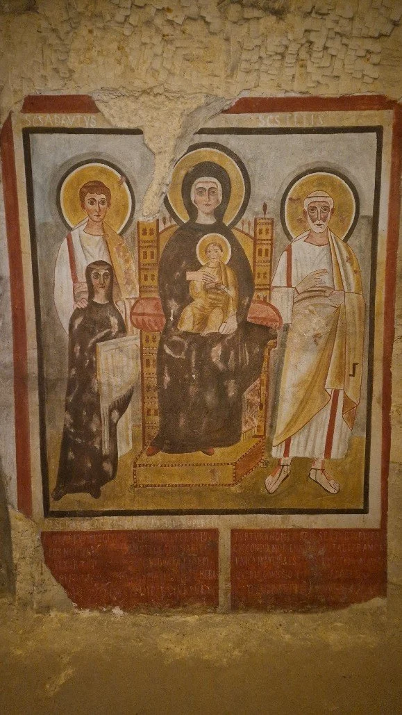 De martelaren Felix en Adauctus begeleiden de overleden vrouw Turtura naar de hemelse troon van Maria. Replica van fresco de Catacombe van Commodilla.